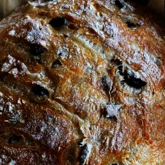 - In a large mixing bowl, combine flour, yeast, and salt. Add water and olives, stirring until a shaggy dough forms.